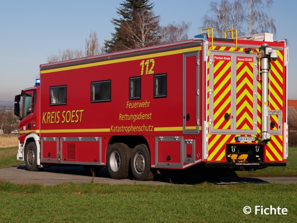 Soest (NW) – Das Rettungszentrum des Kreises Soest erhielt einen ELW 2. Als Fahrgestell dient ein Scania P 360-Dreiachser mit 9,2 l Hubraum, 265 kW (360 PS) Leistung und lenkbarer dritter Achse. Die zulässige Gesamtmasse des vom niederländischen Feuerwehrausrüster Visser in Leeuwarden ausgebauten und mit fünf Klimaanlagen ausgestatteten Fahrzeugs beträgt 26 Tonnen.