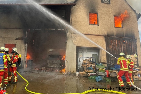 Filderstadt (BW) – Gegen 9 Uhr am Montagvormittag bemerken Zeugen Rauch an einer Scheune im Filderstädter Ortsteil Bernhausen (Kreis Esslingen) und alarmieren Feuerwehr und Polizei. Umgehend alarmierte die Leitstelle die Abteilungen Bernhausen, Bonlanden, Harthausen, Plattenhardt und Sielmingen. Bei Eintreffen der ersten Einheiten stand das Gebäude bereits in Vollbrand. Die Feuerwehr evakuierte sicherheitshalber die umliegenden Gebäude sowie einen Kindergarten. Dann bauten die Feuerwehrleute Riegelstellungen zum angebauten Wohnhaus und den umliegenden Gebäuden auf.