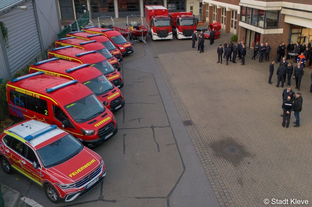 Blick auf die neuen Fahrzeuge der Feuerwehr Kleve: Im Vordergrund der neue Kommandowagen und die Mannschaftstransportwagen, dahinter Boote, Wechselladerfahrzeuge und Abrollbehälter. (Bild: Stadt Kleve)