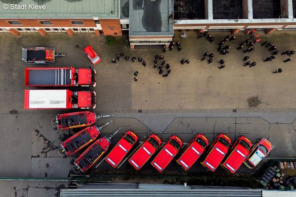 Drohnenaufnahme der Fahrzeugaufstellung an der Hauptwache. (Bild: Stadt Kleve)