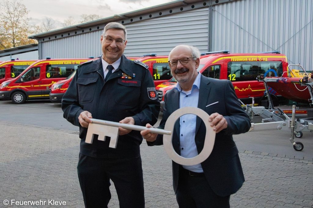Der scheidende Bürgermeister Wolfgang Gebing (r.) übergab symbolisch den Schlüssel an Feuerwehrchef Ralf Benkel. Im Hintergrund Teile des neuen Fuhrparks. (Bild: Feuerwehr Kleve)