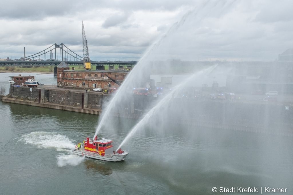 Kürzlich ist das neue Hilfeleistungslöschboot der Feuerwehr Krefeld im Krefelder Hafen eingetroffen. Einsatzkräfte eines kompletten Löschzugs begrüßten das „HLB Krefeld“ mit Wasserwerfern und Blaulicht. Auch ein Großtanklöschfahrzeug (GTLF) war an dem Empfang beteiligt. Die fünfköpfige Besatzung des Bootes reagierte mit einer Vorführung der Wendigkeit des Fahrzeugs sowie der an Bord installierten Wasserwerfer.