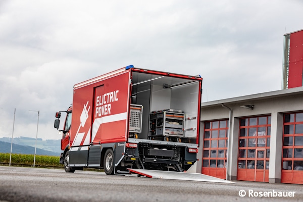 Das Rosenbauer-Logistikfahrzeug hat vier Batterien an Bord, die ausreichend Energie für einen durchschnittlichen Logistikeinsatz mit An- und Abfahrt, Einsatzstellenbeleuchtung (Blitzleuchten, Umfeldbeleuchtung, LED-Innenbeleuchtung) sowie die elektrische Versorgung von Funkgeräten, Laptops, Handscheinwerfern und Ladegeräten liefern. Das Fahrzeug verfügt über ein Rosenbauer CAN-Bus-System, die gesamte Beleuchtung, die Rückfahrkamera und das Heckmikrophon können über ein in der Mittelkonsole des Fahrerhauses verbautes 10-Zoll-Display geschaltet werden. Steckdosen sind sowohl im Fahrerhaus als auch an mehreren Stellen im Aufbau verbaut.