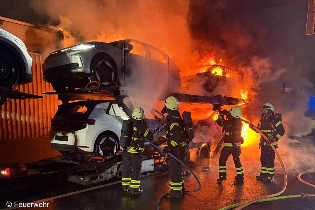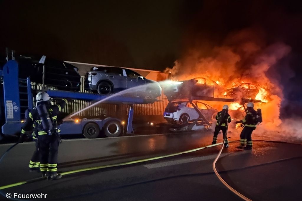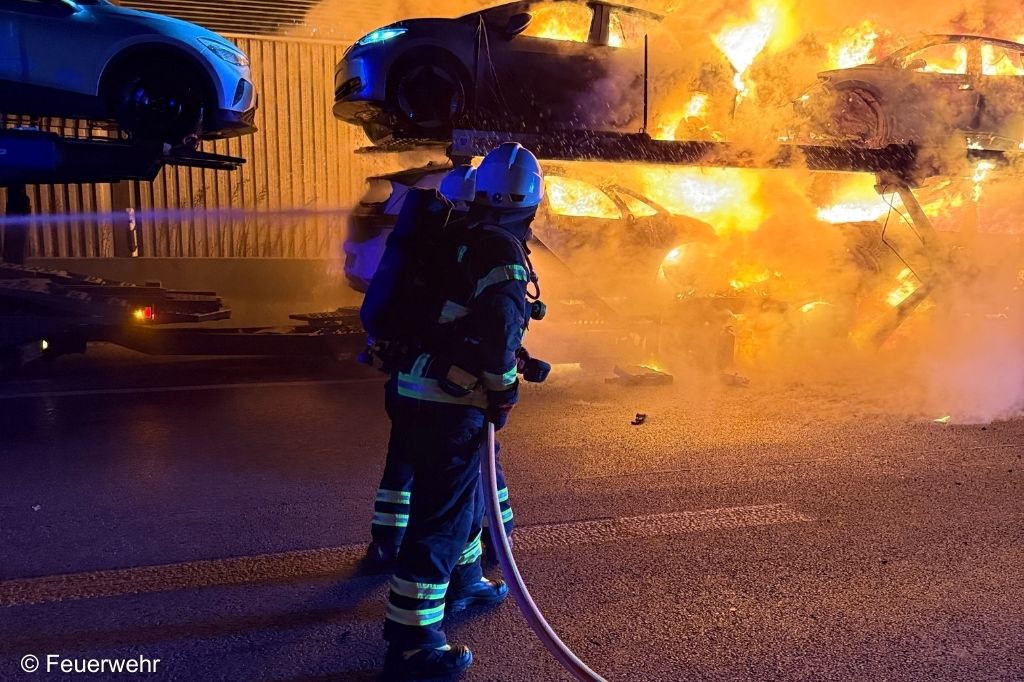 Beim Eintreffen stand der Anhänger des Autotransporters mit vier geladenen Elektro-Pkw in voller Ausdehnung in Brand. Die Flammen drohten unmittelbar auf die Zugmaschine überzugreifen, auf der sich zwei weitere Elektro-Pkw befanden. Zudem hatte das Feuer bereits eine angrenzende Lärmschutzwand erfasst und sich weiter auf die Vegetation in Richtung einer Bahnstrecke ausgebreitet.