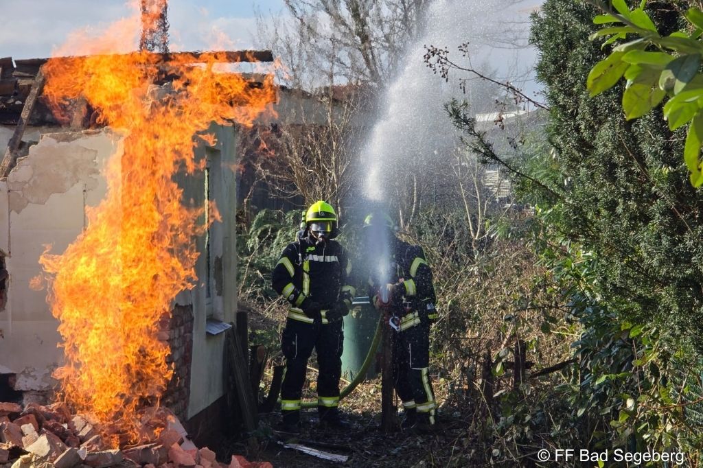 Die Leitstelle alarmierte um 13:18 Uhr die Freiwilligen Feuerwehren Bad Segeberg, Stipsdorf und Klein Gladebrügge. Einsatzleiter war der stellvertretende Gemeindewehrführer Christian Götze. Während die Polizei umliegende Wohnhäuser evakuierte und die angrenzenden Straßen vollständig sperrte, richteten Atemschutztrupps aus Bad Segeberg und Stipsdorf mit zwei C-Rohren eine Riegelstellung ein. Parallel liefen Mess- und Kontrollmaßnahmen.