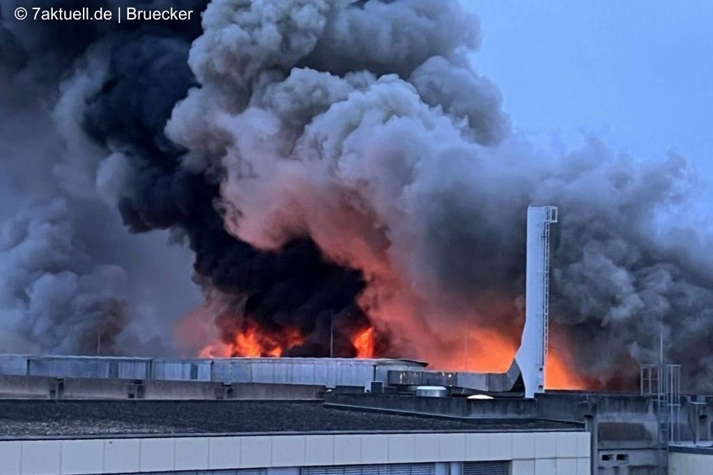 Dichte Rauchwolken und Flammen über einer Halle beim Großbrand auf dem GSI-Gelände in Darmstadt. (Bild: 7aktuell.de | Bruecker)