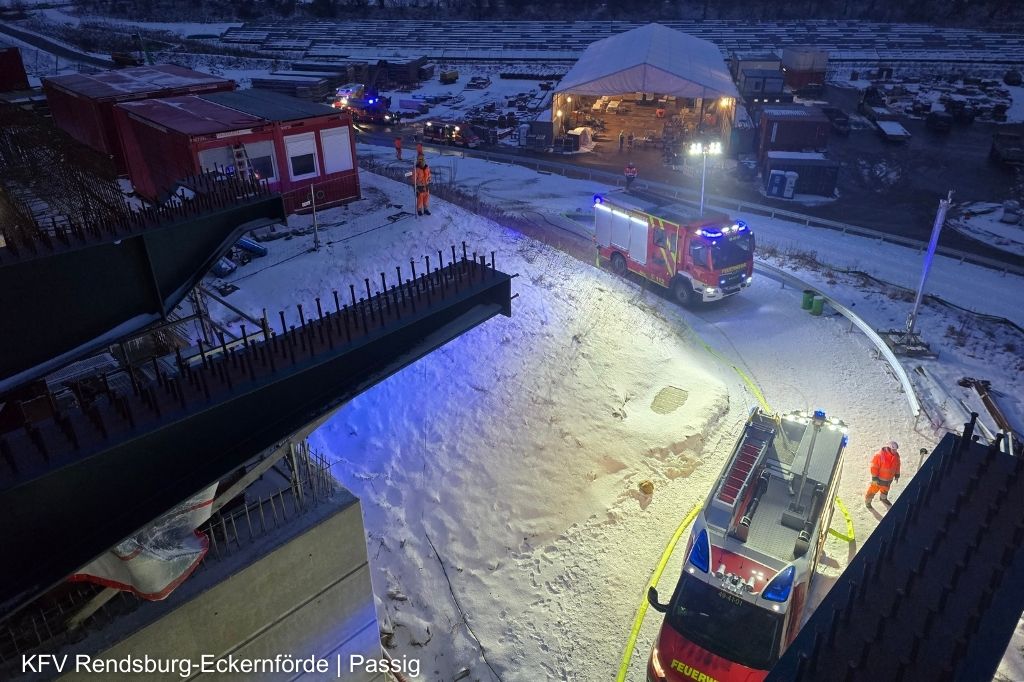 Mit einem Schutzradius von 200 Metern sicherte die Feuerwehr die Einsatzstelle auf der Baustelle der Rader Hochbrücke. Mehrere Fahrzeuge positionierten sich im abgesperrten Bereich. (Bild: KFV Rendsburg-Eckernförde | Passig)