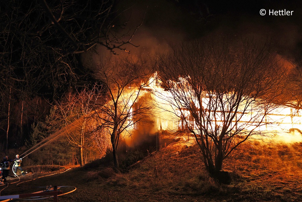Beim Eintreffen der ersten Kräfte steht das hölzerne Gebäude bereits lichterloh in Vollbrand. Ein Innenangriff ist aufgrund der massiven Brandentwicklung nicht mehr möglich. Die Feuerwehr leitet daher umgehend einen Löschangriff von außen ein. Mit mehreren Strahlrohren verhindern die Einsatzkräfte, dass die Flammen auf die angrenzende Vegetation übergriffen.