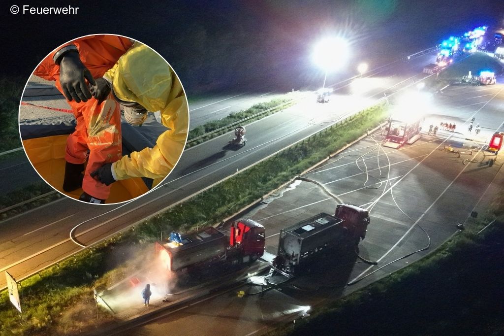 Die Feuerwehr sperrt die Autobahn in Fahrtrichtung Süden und richtet einen 50-Meter-Sicherheitsradius ein. Unter Chemikalienschutzanzügen sichern Trupps die Leckage am Flansch des Tanks – doch die aggressive 98-prozentige Säure greift sogar das Material der Schutzanzüge an.