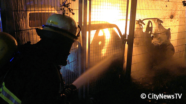Feuerwehrleute löschen im Hamburger Stadtteil Marienthal brennende Autos. Foto: CityNewsTV