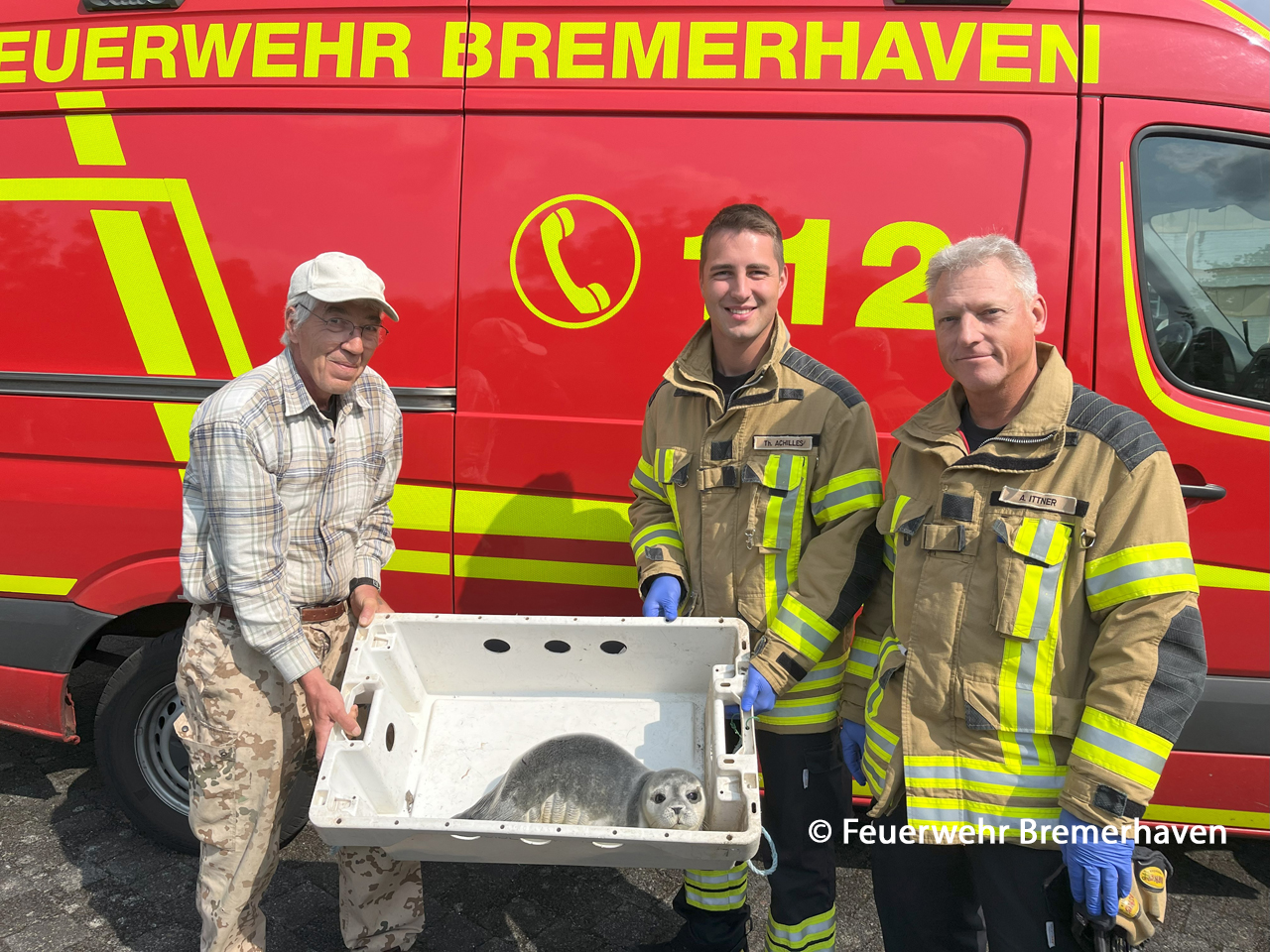 Übergabe des kleinene Heulers an Rüdiger Gimber von der Seehundstation Norddeichdurch Thorben Achillis und Andreas Ittner (von links). (Bild: Feuerwehr Bremerhaven)
