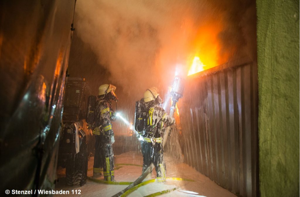 Gegen 2.30 Uhr wurde der Brand in der Autowerkstatt gemeldet. Ein Großaufgebot der Wiesbadener Feuerwehr rückte an. Sven Jannek von der Feuerwehr Wiesbaden beschreibt die Situation kurz nach dem Eintreffen: “Es waren Detonationen, vermutlich ausgehend von Gasflaschen zu hören. Wir mussten uns deshalb auf den Außenangriff beschränken, um die Einsatzkräfte nicht zu gefährden.” Das Feuer breitete sich auch auf daneben geparkte Fahrzeuge aus.