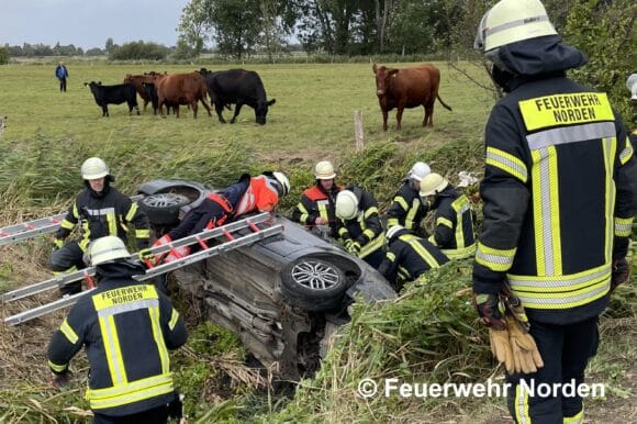 Norden (NI) – Am Freitagmittag verunfallte eine Frau mit ihrem Auto auf der Landstraße L27 in Norden (Kreis Aurich). Der Wagen kam in einem Graben zwischen einer Straße und einer Kuhweide zum Liegen. Eine Herde neugieriger Rinder beobachtete den Einsatz. Lediglich ein Stromdraht trennte Einsatzkräfte und Tiere. Ein Landwirt vertrieb die Herde sicherheitshalber, damit die Rettung ungestört vollbracht werden konnte.