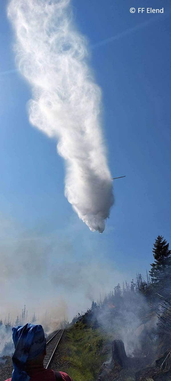 Bis zu 120 Feuerwehrleute bekämpfen den Waldbrand am Brocken im Harz. Die Harzer Schmalspurbahn befördert mit Kesselwagen Wasser an die Einsatzstelle. Foto: FF Elend