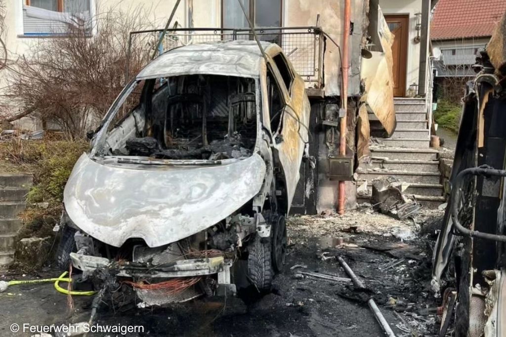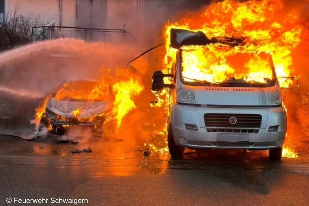 Um 7:38 Uhr alarmierte die Leitstelle die Feuerwehr Schwaigern mit dem Stichwort „Rauchentwicklung Wohngebäude – E-Auto brennt an Fassade stehend“. Beim Eintreffen standen sowohl das an einer Ladesäule angeschlossene Elektrofahrzeug als auch das daneben abgestellte Wohnmobil in Vollbrand.