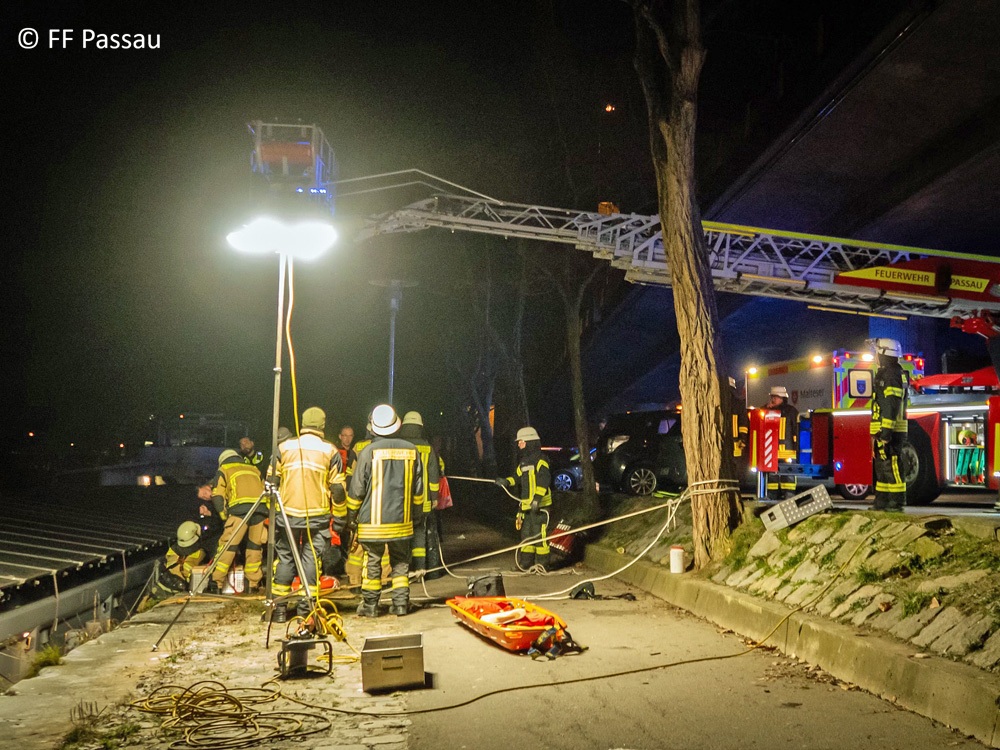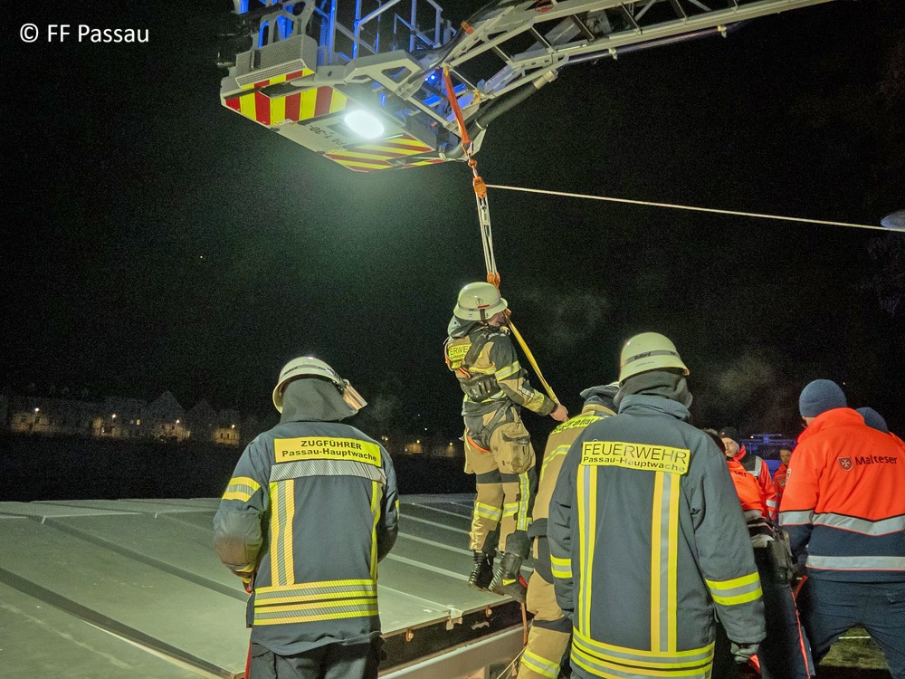 Der Mann gerät dabei zwischen ein Frachtschiff und die Kaimauer. Er kann sich aus eigener Kraft nicht befreien. Passanten werfen ihm einen Rettungsring zu, bis die Einsatzkräfte der FF Passau eintreffen. Aufgrund der glatten Kaimauer gestaltet sich die Rettung schwierig: In einer aufwendigen Aktion wird eine Einsatzkraft per Rettungsgeschirr an der Drehleiter gesichert und von dort aus zu dem Mann heruntergelassen. Sie kann den stark unterkühlten Mann aus dem Wasser ziehen.