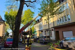 Wenig später zündet der Dachstuhl durch. Der Innenangriff muss abgebrochen werden. Kurz nach dem Eintreffen der ersten Unterstützungskräfte aus Katzenelnbogen mit ihrer Drehleiter stürzen Teile des Daches mit dem markanten Glockenturm ein.