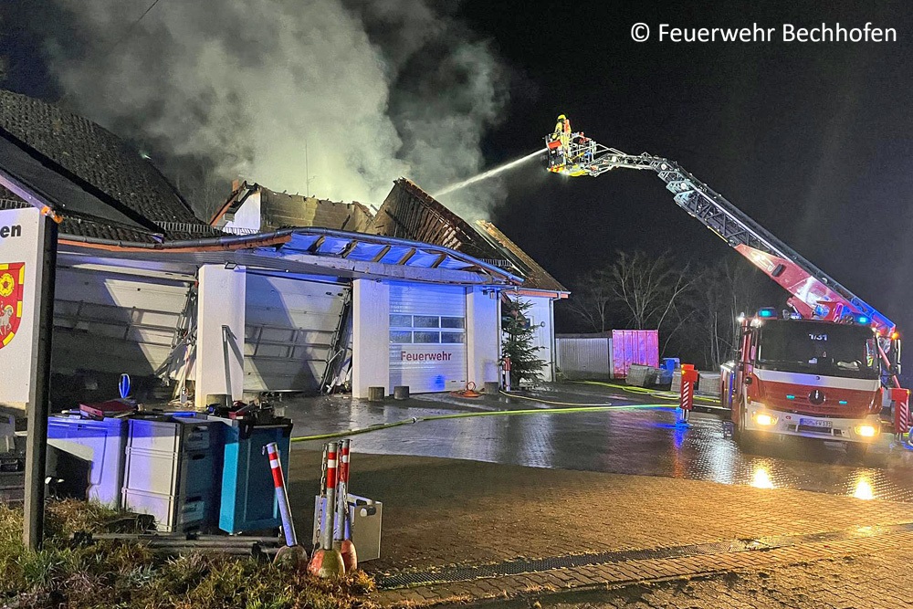Bechhofen (RP) – Ein Brand vernichtet am Sonntagmorgen (21. Dezember) um 4:30 Uhr das Feuerwehrhaus der FF Bechhofen (Kreis Südwestpfalz, Verbandsgemeinde Zweibrücken-Land). Das Gebäude brennt vollständig aus. Drei Fahrzeuge werden gerettet, sieben Feuerwehrleute vorsorglich medizinisch untersucht.