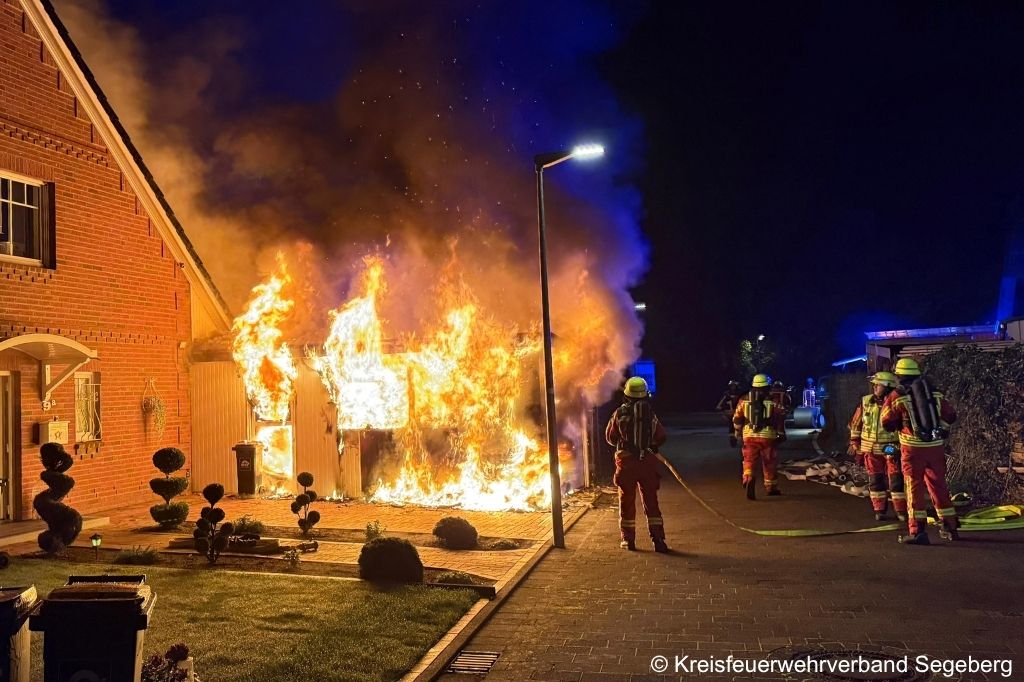 Kaltenkirchen (SH) – Ein nächtlicher Brand einer Leichtbaugarage hat am frühen Donnerstagmorgen im Kreis Segeberg einen Großeinsatz für die Feuerwehr ausgelöst. Beim Eintreffen der ersten Kräfte hatten die Flammen bereits von einem Pkw und der Garage auf den Dachstuhl einer angrenzenden Doppelhaushälfte übergegriffen. Durch einen schnellen und personalintensiven Einsatz konnte die Feuerwehr eine weitere Ausbreitung verhindern.