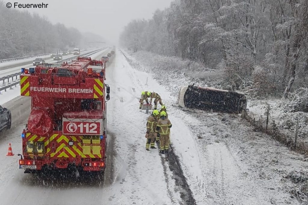 In Bremen kam es am Sonnabendmorgen zu einem Unfall mit einem Fahrzeug der Feuerwehr. Gegen 10:25 Uhr geriet ein Kleintransporter, der für Versorgungsfahrten zwischen den Feuer- und Rettungswachen eingesetzt wird, auf schneeglatter Fahrbahn ins Schleudern. Das Fahrzeug kam auf der A27 in Fahrtrichtung Hannover in Höhe des Stadtwaldsees von der Fahrbahn ab und blieb auf der Seite liegend auf einem schneebedeckten Grünstreifen liegen. Der Fahrer blieb unverletzt. Einsatzkräfte der Feuer- und Rettungswache 7 bargen den stark beschädigten Transporter mit schwerem Gerät. Anschließend brachte ein Abschleppfahrzeug das Fahrzeug zur Feuer- und Rettungswache 1. Die Feuerwehr Bremen empfahl angesichts der Witterung, Fahrten möglichst zu vermeiden und die Fahrweise den Straßenverhältnissen anzupassen.