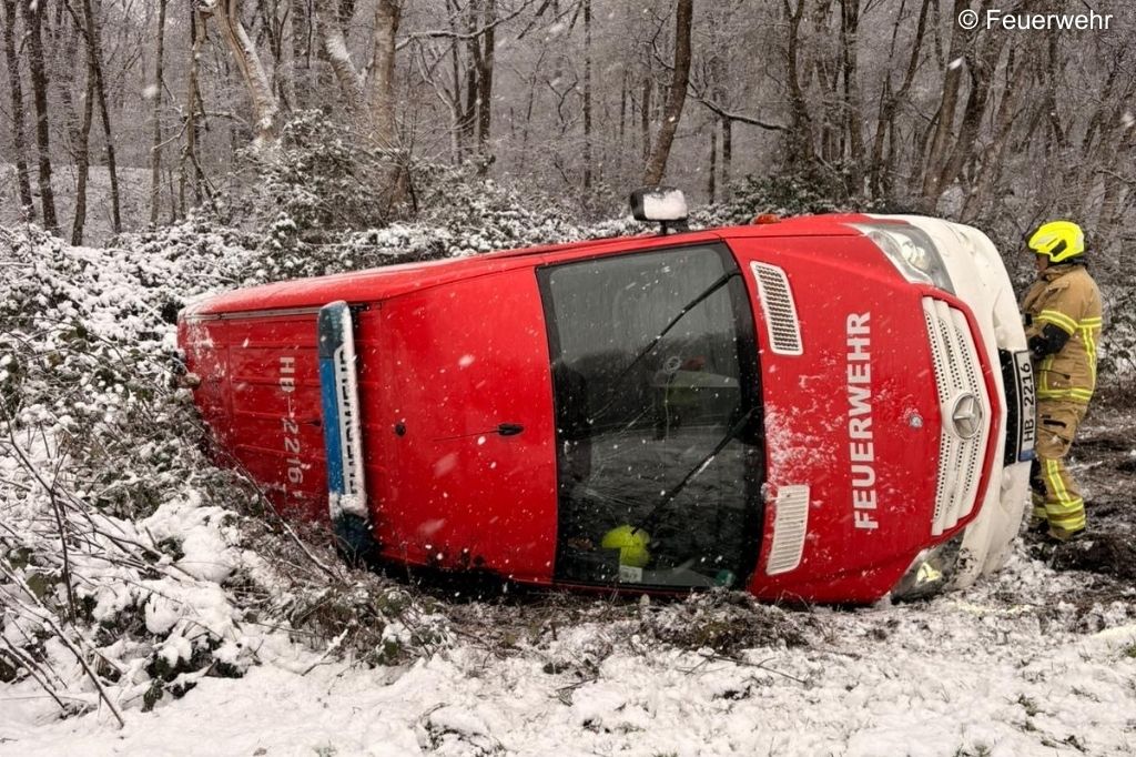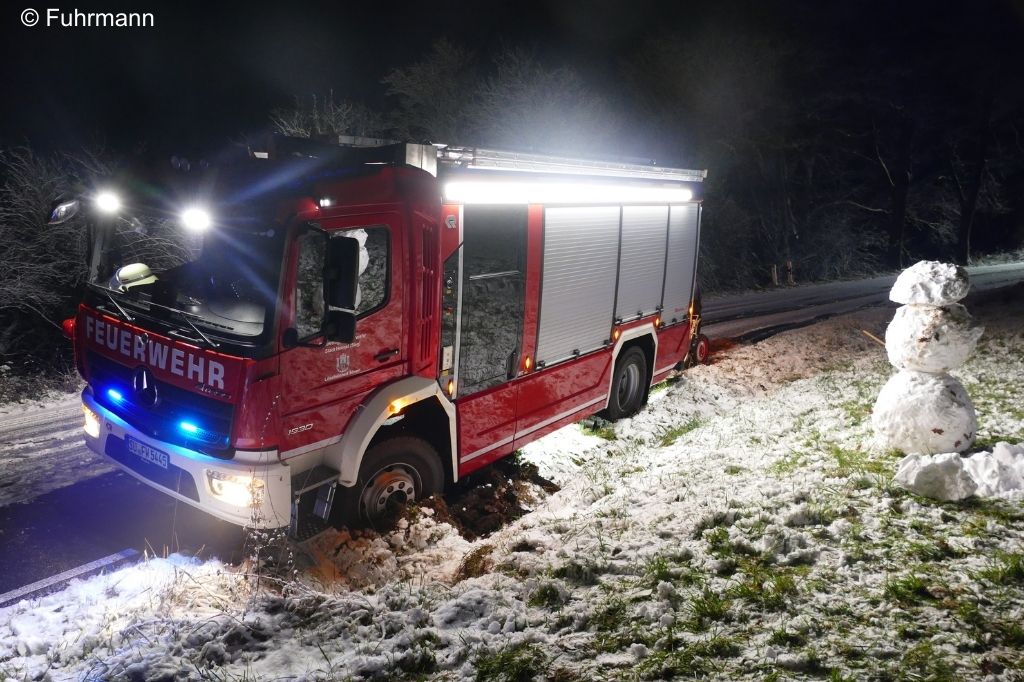 Ein weiterer Vorfall ereignete sich bereits am Freitagabend bei einem Einsatz der Löscheinheit Söven. Auf der L125 zwischen Kurenbach und Lanzenbach im Rhein-Sieg-Kreis hatte sich aufgrund des verschneiten Wetters ein Verkehrsunfall ereignet. Auf der Anfahrt zur Einsatzstelle rutschte das Hilfeleistungslöschfahrzeug (HLF) der Einheit von der Fahrbahn in einen Graben und fuhr sich dort fest. Auch in diesem Fall blieben alle Beteiligten unverletzt.