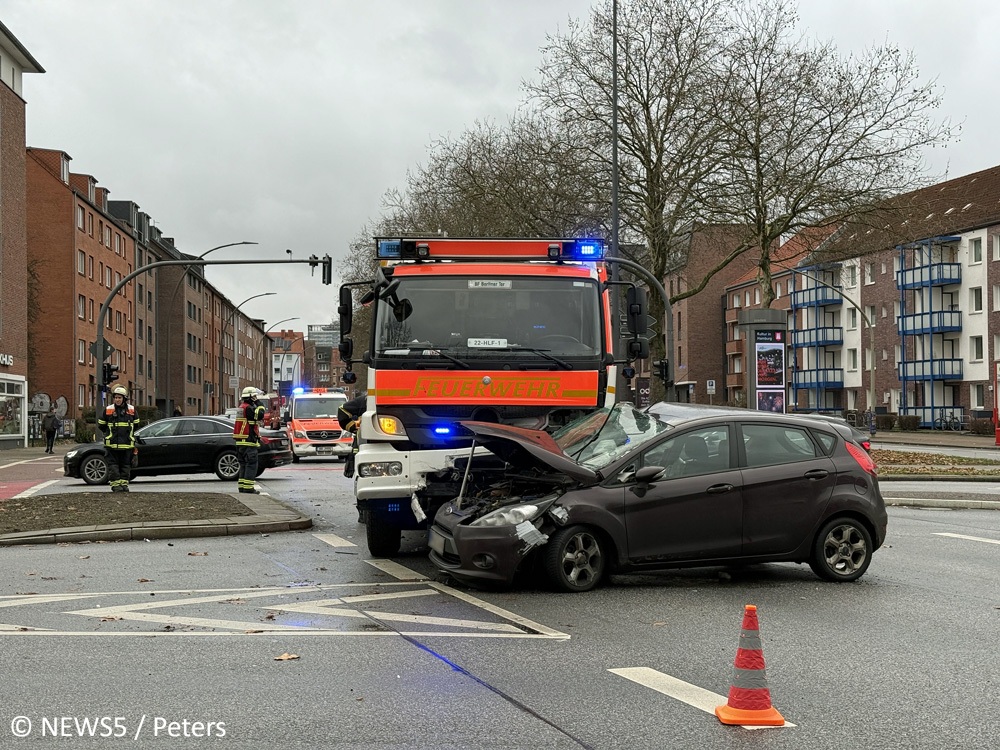In Hamburg-Wandsbek stoßen auf einer Kreuzung ein HLF der Berufsfeuerwehr sowie ein Ford Fiesta zusammen. Dessen Fahrer wird beim Aufprall verletzt. Foto: © NEWS5 / Peters