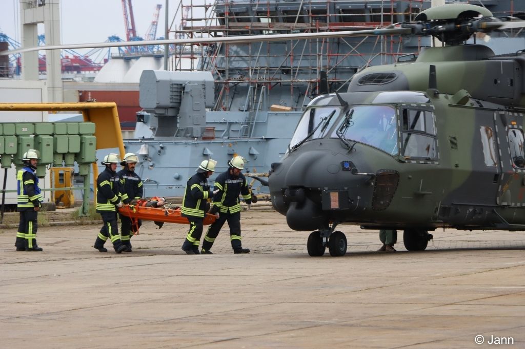 Parallel dazu übten Militär und Sicherheitsbehörden den Schutz kritischer Infrastruktur, unter anderem mit Blick auf mögliche Drohnenbedrohungen. Am Samstag folgte eine MANV-Lage auf dem Gelände der Werft Blohm+Voss. Auf der im Bau befindlichen Korvette Augsburg mussten insgesamt 80 Verletzte gerettet werden. Die Werkfeuerwehr leitete die Rettung ein, während NH90-Hubschrauber der Bundeswehr den Abtransport der Patienten übernahmen und Feldjäger die Einsatzstelle absicherten.
