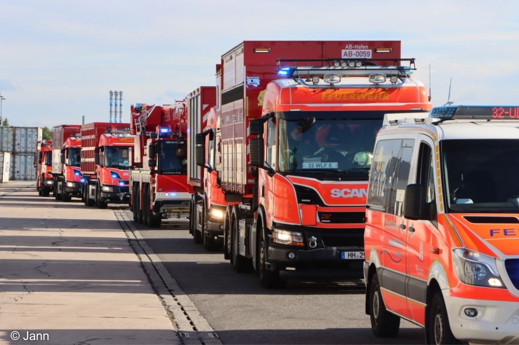 Einsatzfahrzeuge der Technik- und Umweltschutzwache (F32) der Feuerwehr Hamburg rücken im Hafengebiet zum Übungseinsatz an. (Bild: Jann)