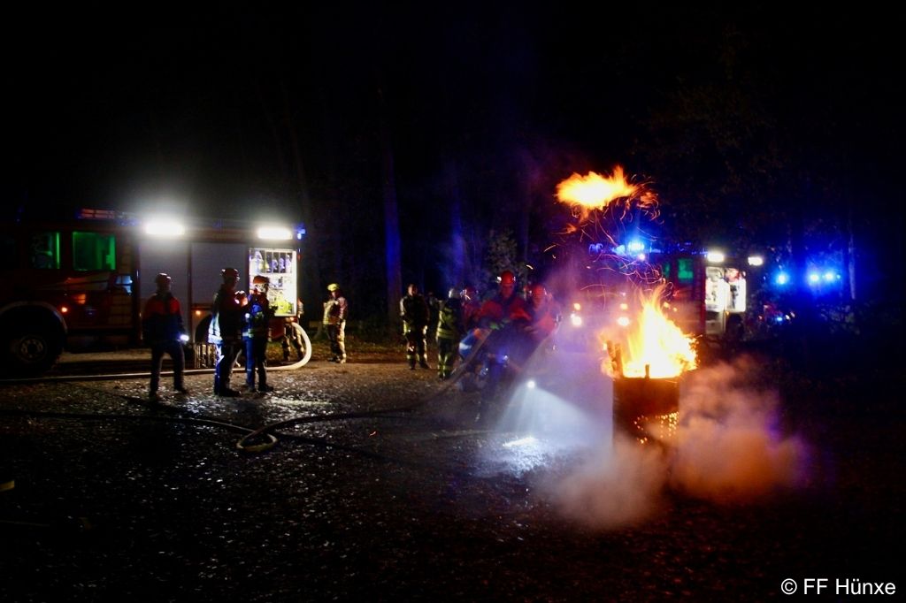 Nächtliche Übung: Unter Anleitung der Betreuer bekämpfen die Jugendlichen ein brennendes Fass und trainieren den Löschangriff. (Bild: FF Hünxe)