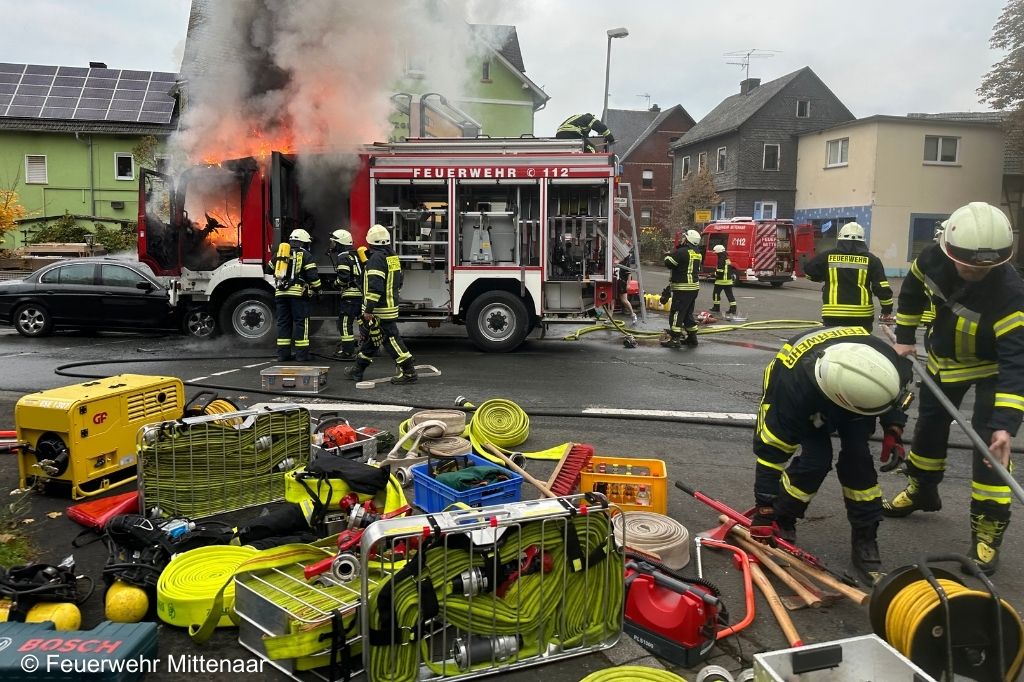 Um 8:08 Uhr erhielt die FF Mittenaar die Alarmierung „F1 PKW-Brand“. Wenige Minuten später rückten unter anderem ELW 1 und LF 20 aus; außerdem folgten TSF-W, GW und weitere Transportfahrzeuge. Aufgrund der Lage wurde die Feuerwehr Herborn-Seelbach frühzeitig hinzugezogen. Vor Ort übernahm der stellvertretende Gemeindebrandinspektor Sebastian Röger die Einsatzleitung. Mit Schnellangriff und Schaumrohr vom LF 20 brachten die Kräfte den Brand zügig unter Kontrolle. Während der Löscharbeiten räumten Einsatzkräfte so viel Material wie möglich aus den Geräteräumen des LF 10 KatS. Aus der Mannschaftskabine und vom Fahrzeugdach wurden jedoch mehrere Einsatzmittel irreparabel beschädigt.