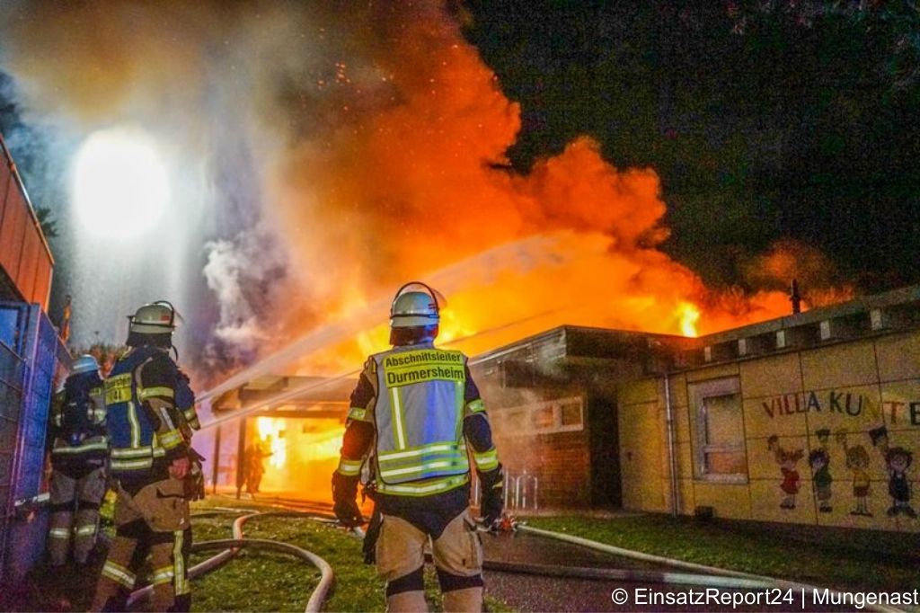 Durmersheim (BW) – In der Nacht auf Dienstag hat ein Großbrand den Kindergarten „Villa Kunterbunt“ in Durmersheim im Kreis Rastatt vollständig zerstört. Gegen Mitternacht meldeten mehrere Anrufer ein Feuer in dem kommunalen Gebäude. Bereits auf der Anfahrt sahen die ersten Kräfte meterhohe Flammen und eine massive Rauchentwicklung über dem Ortsgebiet.