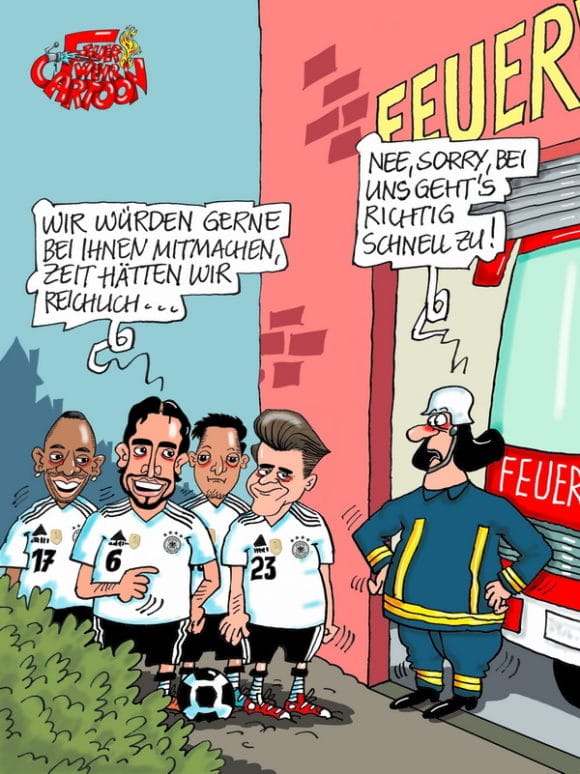 Nach den Auftritten bei der Fußball-WM in Russland bezweifelt Feuerwehr-Magazin-Cartoonist Rabe, dass die deutschen Nationalspieler eine Verstärkung für die Feuerwehr wären. Cartoon: Rabe