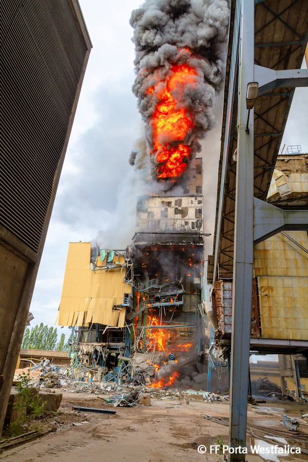 Porta Westfalica (NW) – Die Freiwillige Feuerwehr Porta Westfalica (Kreis Minden-Lübbecke) wurde am Mittwoch, 10. Juli 2019, um 18.19 Uhr zu einem Großbrand im ehemaligen Gemeinschaftskraftwerk Veltheim alarmiert. Die Rauchgasentschwefelungsanlage brannte in voller Ausdehnung, Teile des Gebäudes stürzten ein. Personen wurden nicht verletzt, das betroffene Gebäude brannte aus.