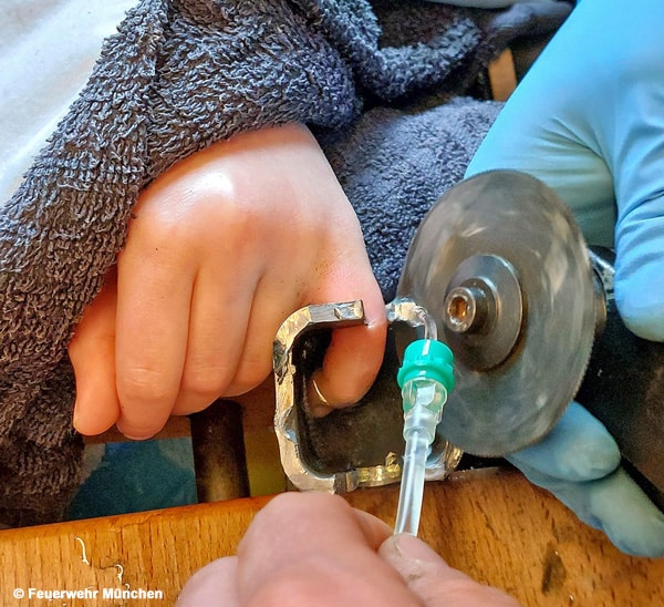 Wörtlich heißt es in einer Pressemitteilung der Berufsfeuerwehr: “Nun begannen die Einsatzkräfte zuerst das schwere Rohr abzuschneiden, dass ein Herankommen an den eingeschlossenen Finger überhaupt möglich war. Zwei Entlastungsschnitte längs des Rohres sollten das Material so schwächen, dass es auseinandergedrückt werden könnte. Leider zeigte sich das Rohr aber von dieser Maßnahme völlig unbeeindruckt. Das hydraulische Rettungsgerät, mit dem Personen aus Autos nach Unfällen befreit werden, konnte nicht genug Kraft aufwenden, um das Rohr auseinanderzubiegen.”