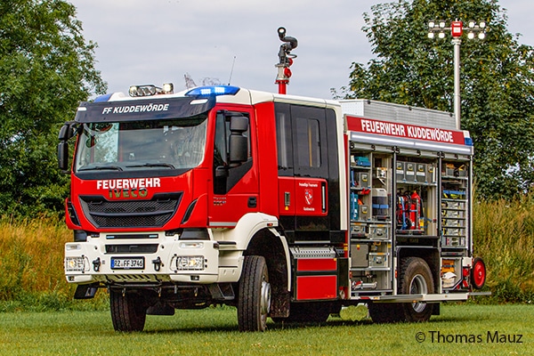 Kuddwörde (SH) – Den vermutlich letzten Iveco Trakker als kommunales Löschfahrzeug vor Auslauf der Serie hat die FF Kuddewörde (Kreis Herzogtum Lauenburg) erhalten. Magirus fertigte den AluFire3-Aufbau des LF 20 auf einem 18-Tonnen-Allradfahrgestell Trakker AD 190 T 36 W mit 360 PS und automatisiertem Schaltgetriebe. Der Radstand beträgt 4,5 m.