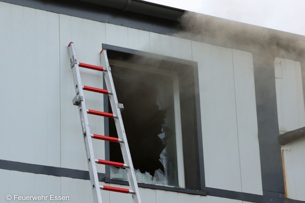 Über eine Leiter verschafften sich Einsatzkräfte Zugang zu weiteren Gebäudeteilen, da nicht alle Bereiche von innen erreichbar waren. (Bild: Feuerwehr Essen)
