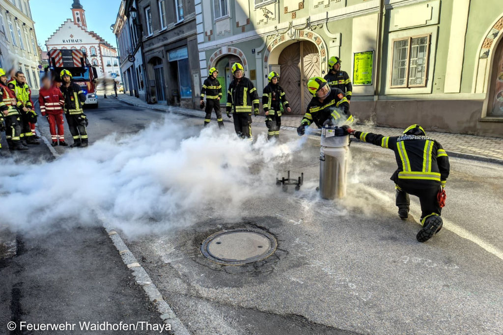 Gegen 13:30 Uhr alarmierte die Leitstelle die Freiwillige Feuerwehr Waidhofen/Thaya zu einem Schadstoffeinsatz. Laut erster Meldung befand sich eine Sauerstoffflasche im Treppenhaus, der Bereich war stark vernebelt.