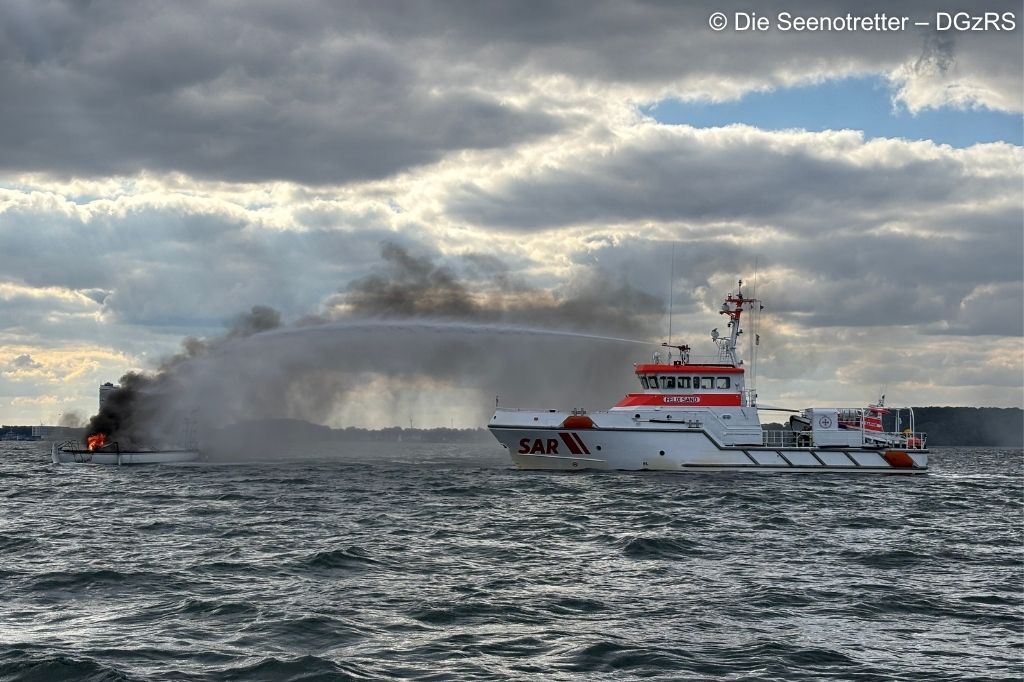 Der Seenotrettungskreuzer FELIX SAND der DGzRS bekämpft den Brand auf einer Segelyacht vor Travemünde. (Bild: Die Seenotretter – DGzRS)