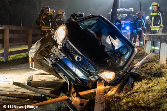 Kurz hinter Seebruck kam ein Smart von der Straße ab und blieb an einem Brückengeländer hängen. Foto: 112News | Benje
