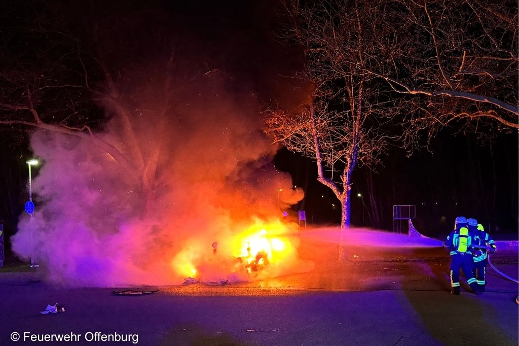 Gegen 22 Uhr alarmierte die Leitstelle die Feuerwehr Offenburg zu dem Fahrzeugbrand in der Ahornallee. Beim Eintreffen stand der Tesla bereits in Vollbrand und brannte in voller Ausdehnung. Nach Angaben der Feuerwehr blieb es trotz intensiver Flammen und starker Rauchentwicklung bei diesem Schaden, weil die Parkfläche ansonsten leer war und keine Gefahr für Personen oder weitere Fahrzeuge bestand.