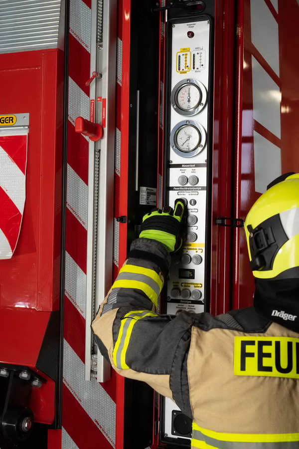 Dank der Gestaltung des Hecks ist der Dachaufstieg jederzeit möglich – und zwar ohne den Zugang zur Ladebordwand des Castra zu beschränken. Gleichzeitig kann die Aufstiegsleiter als Hilfe zum Besteigen der geöffneten Ladebordwand genutzt werden. Auch die Kombination mit Leiterentnahmehilfen ist problemlos möglich. Und die Integration des Pumpenbedienfelds in die Rückleuchtenblende spart nicht nur Platz in den Geräteräumen, sondern ermöglicht dem Maschinisten auch einen besseren Überblick über das Geschehen am Fahrzeug und der Einsatzstelle.