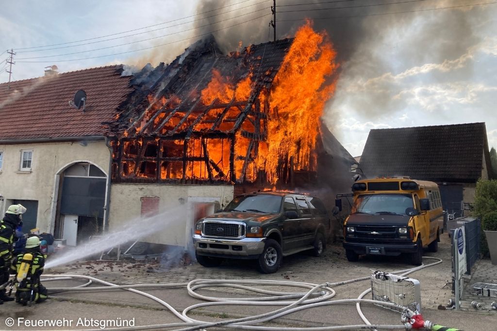 In Neubronn (BW) kämpfen Feuerwehr und Dorfbewohner an einem der heißesten Tage des Jahres gegen den Brand in einem US-Oldtimer-Hof. Dank zweier Tanksattelzüge steht die Löschwasserversorgung.