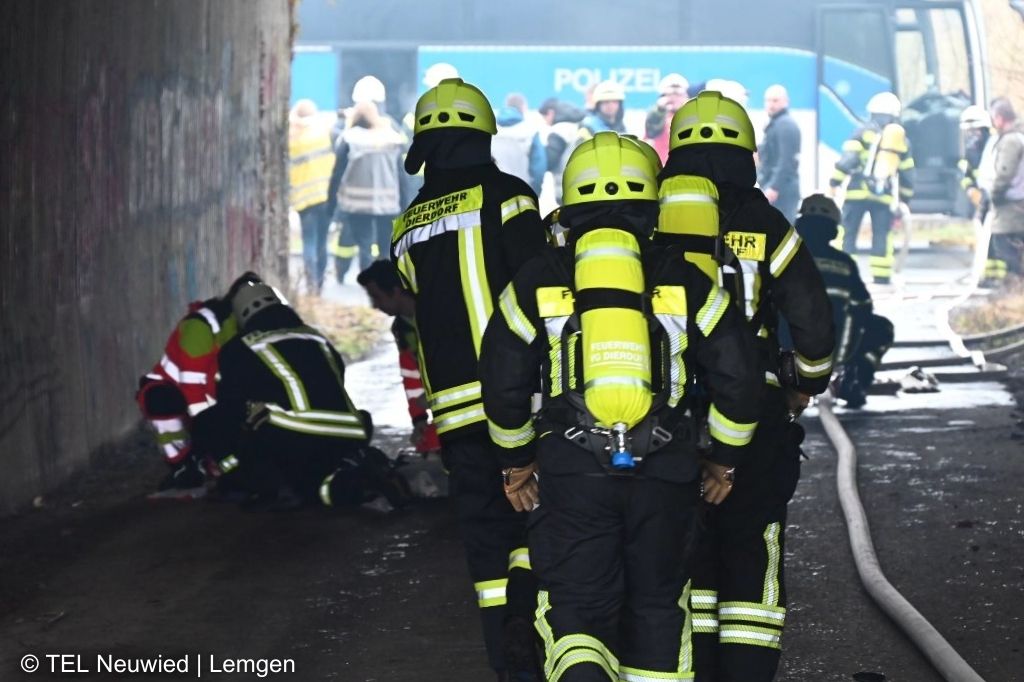 Unter Atemschutz gehen Einsatzkräfte der Feuerwehr zur Brandbekämpfung vor, während im Hintergrund Kräfte des Rettungsdienstes sowie des Sanitäts- und Betreuungsdienstes die dargestellten Fahrgäste erstversorgen. (Bild: TEL Neuwied | Lemgen)