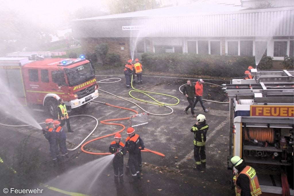 Die Übungsleitung hatte einen Brand mit starker Rauchentwicklung und eingeschlossenen Personen vorbereitet. 40 „Schüler“ – dargestellt durch 20 Mimen und 20 Puppen – konnten ihre Klassenräume nicht selbstständig verlassen. Mehrere Trupps gingen unter Leitung erfahrener Feuerwehrkräfte zur Menschenrettung in das Gebäude vor, während parallel die Brandbekämpfung von außen eingeleitet wurde.