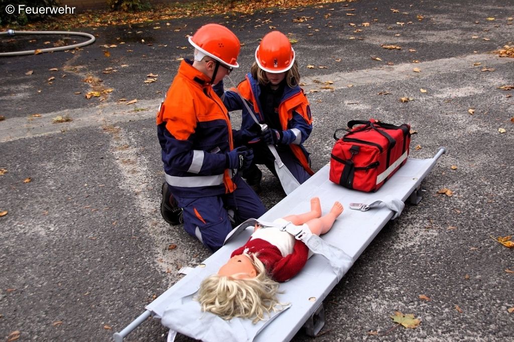 Nach der Rettung übernahmen die jungen Anwärterinnen und Anwärter die Erstversorgung der „Verletzten“ und bereiteten die Übergabe an die DRK-Sanitätskräfte vor. (Bild: Feuerwehr)