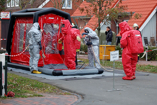 Dekon-Stelle nach Gefahrgutunfall auf Langeoog. Foto: Sven Meyer/FF Wittmund