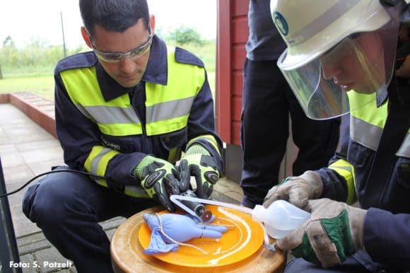 Auch diese Übung schafft Sicherheit sowie Schnelligkeit, immer wieder vorkommende Fehler wie ein aufbehaltenes Visier werden abgestellt. Ganz wichtig: der Unfallschutz. Auch wenn es schnell gehen soll, dürfen dabei nie Unfallverhütungsvorschriften außer Kraft gesetzt werden.